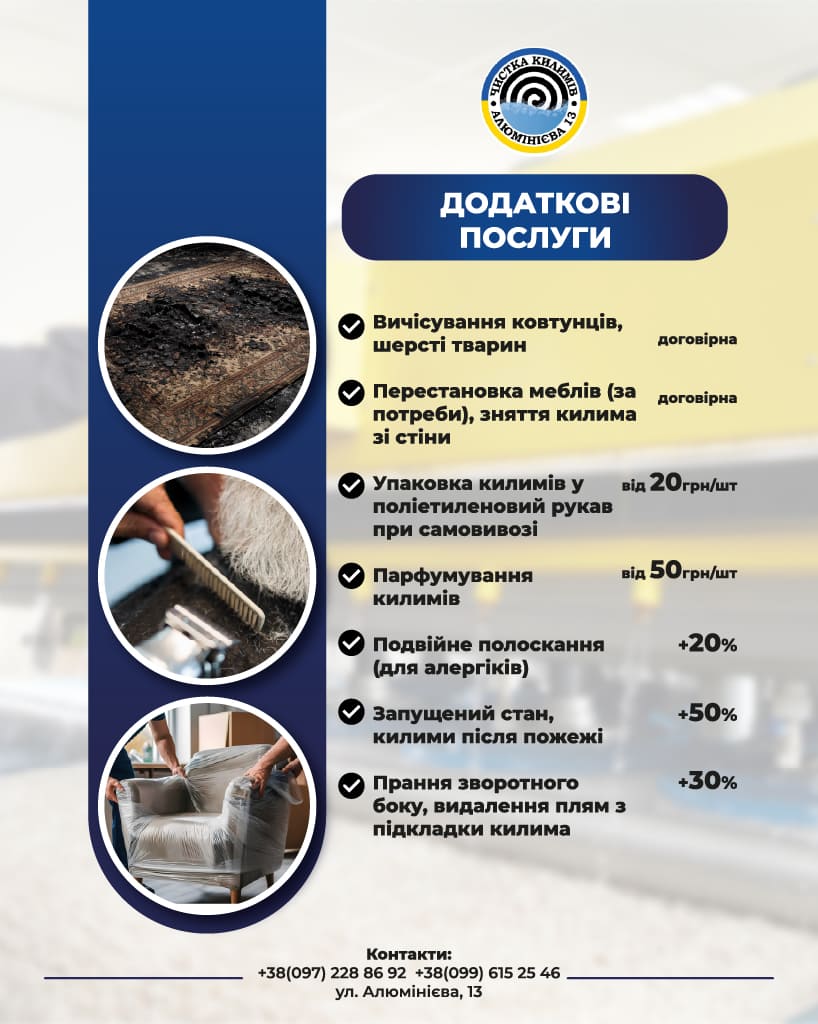 * Ціна вказана за чистку одного килима без урахування додаткових послуг та доставки (дивіться в Прайсі)